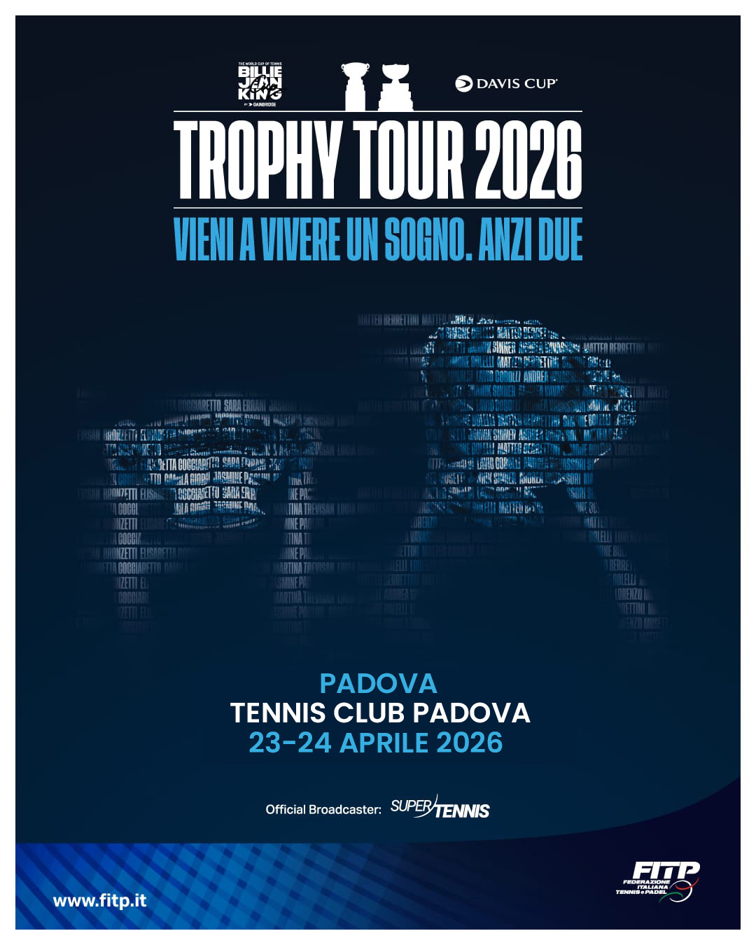 Padova si tinge d’azzurro. Il 23 e 24 aprile, il Tennis Club Padova avrà l’onore di ospitare le icone leggendarie del tennis mondiale: la Coppa Davis e la Billie Jean King Cup.